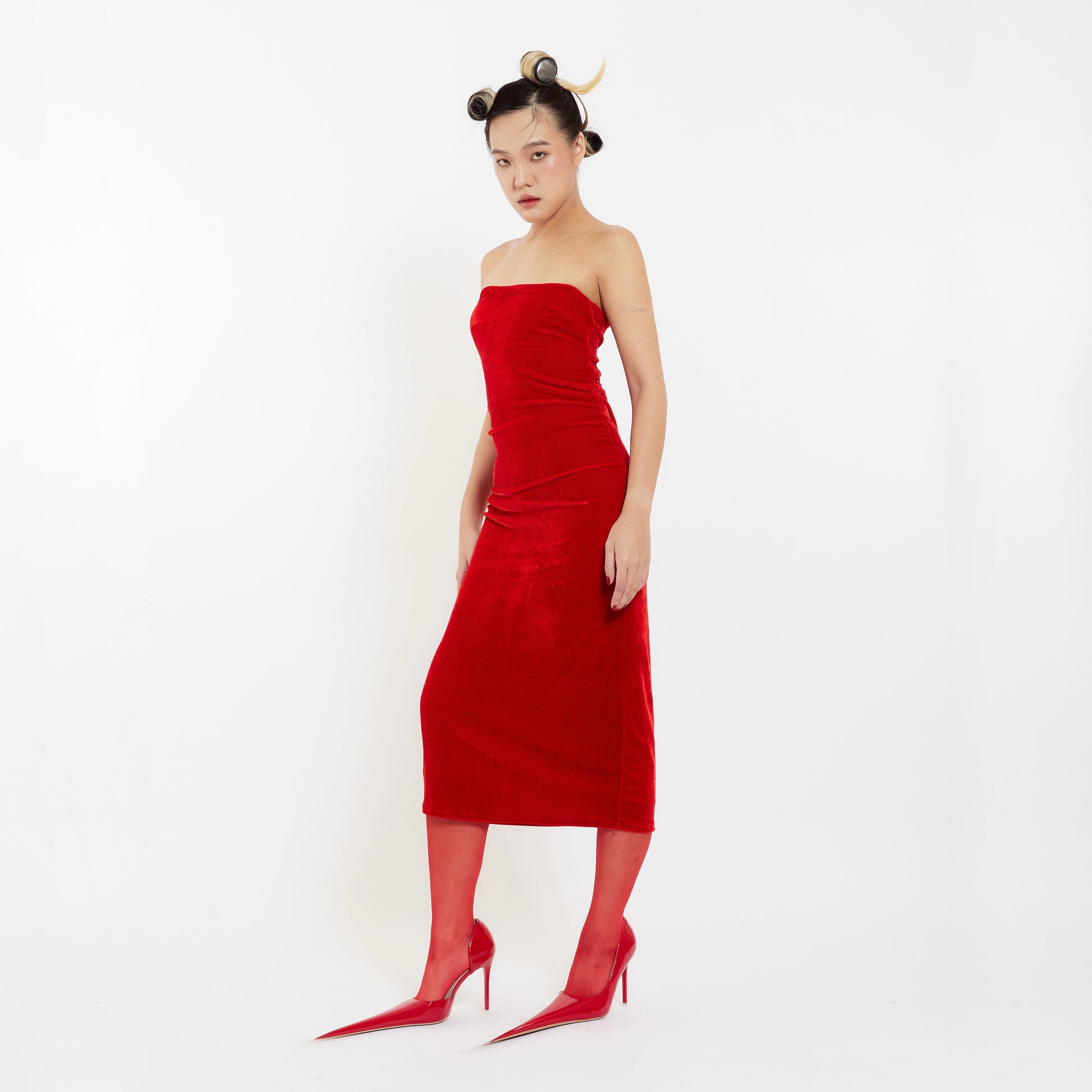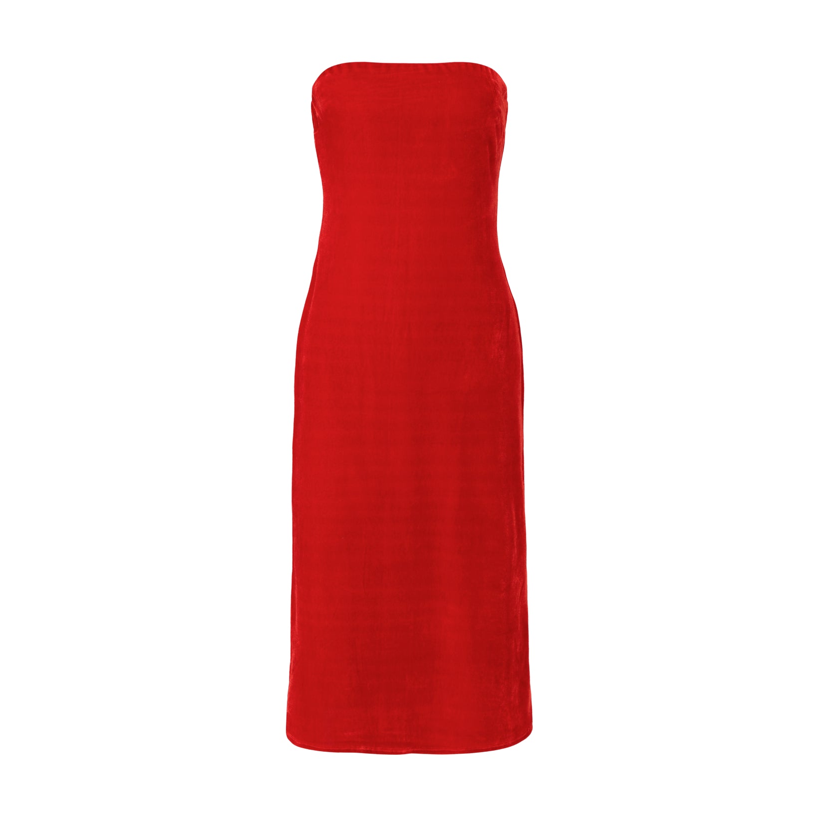 A strapless satin dress featuring a slight A-line silhouette in a midi length. Designed for effortless elegance.