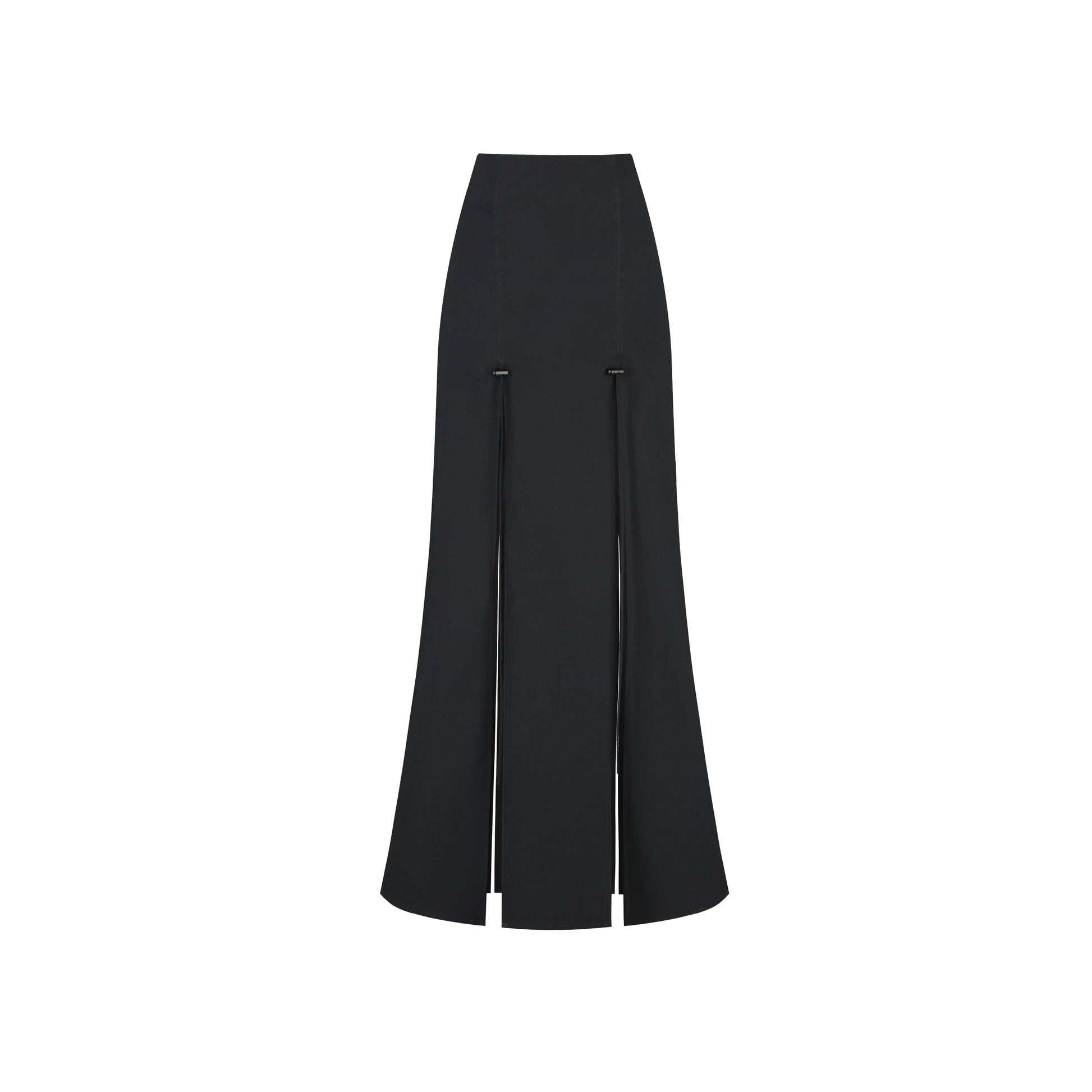 A stunning maxi skirt designed to make a statement, features a high waist for a flattering silhouette, double slit front for a daring yet elegant look, adjustable drawstring details for a customizable fit, flowing hem for enhanced movement, and a concealed back zipper for a seamless finish.